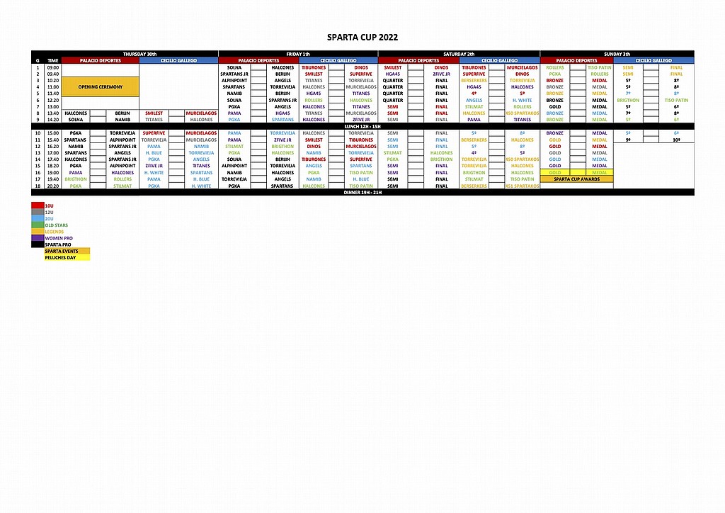 Solna kliver in i turneringen kl. 14:20 (spansk tid) på torsdagen den 30/6 och spelar därefter kl. 09:00, 12:20 samt 17:40 fredagen den 1/7. Därefter väntar eventuell kvartsfinal på lördagen den 2/7 någon gång mellan 10:20-12:20. Eventuell semifinal spelas sedan samma kväll vid antingen 19:40 eller 20:20 och placeringsmatcher spelas på söndagen den 3/7.